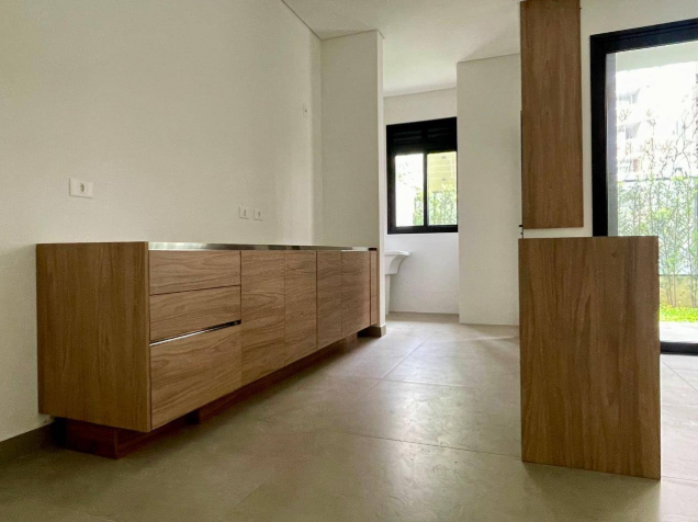 O Apartamento conta com 144,44 m² privativos (106,52 m² internos + 37,92 m² garden descoberto com grama natural) distribuídos da seguinte forma;