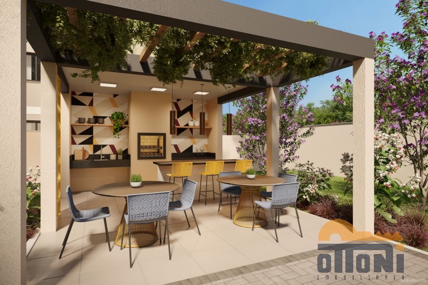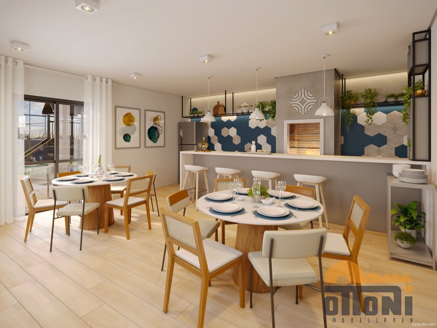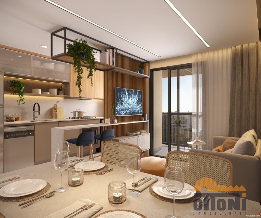 Sala de estar e jantar integradas, cozinha, área de serviço, banheiro social, sacada com churrasqueira, gás individual e hidrômetro individual.